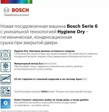 Посудомоечная машина Bosch SMS6HMW01R, полноразмерная, напольная, 60см, загрузка 13 комплектов, белая интересное: