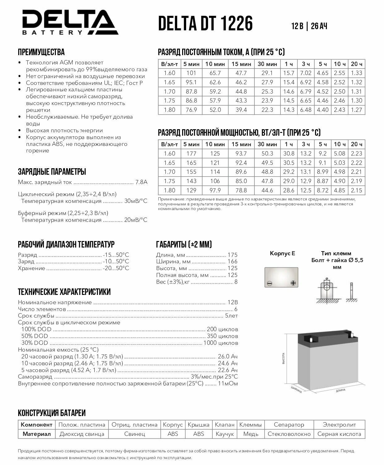 DELTA BATTERY DT1226 Аккумулятор ИБП 12В 26А.ч. DELTA (DT 1226) (166х175х125) AGM***