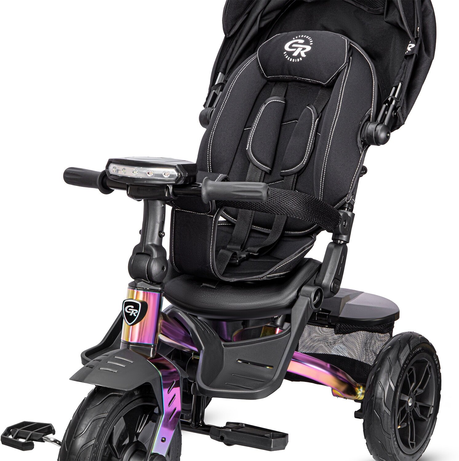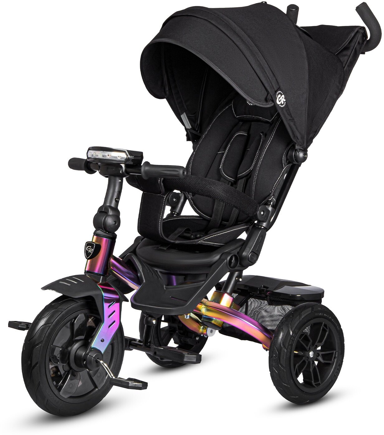 Купить Велосипел детский трехколесный ТМ "CITY-RIDE LUNAR". Пятиугольная рама, складная крыша D600, фара свет/звук, подножки, надувные колеса 12"/10", ножной тормоз, поворот сиденья на 360гр. Цвет черный, хамелеон