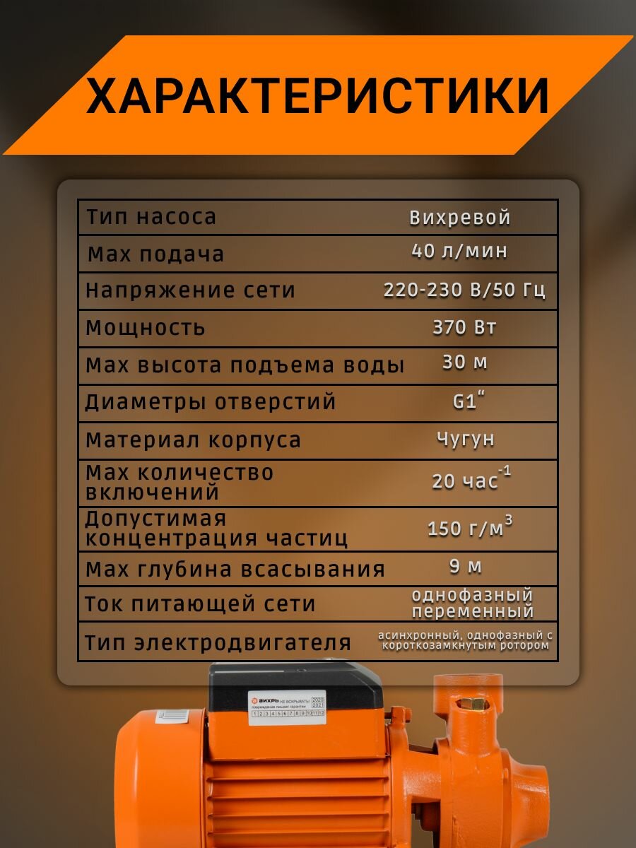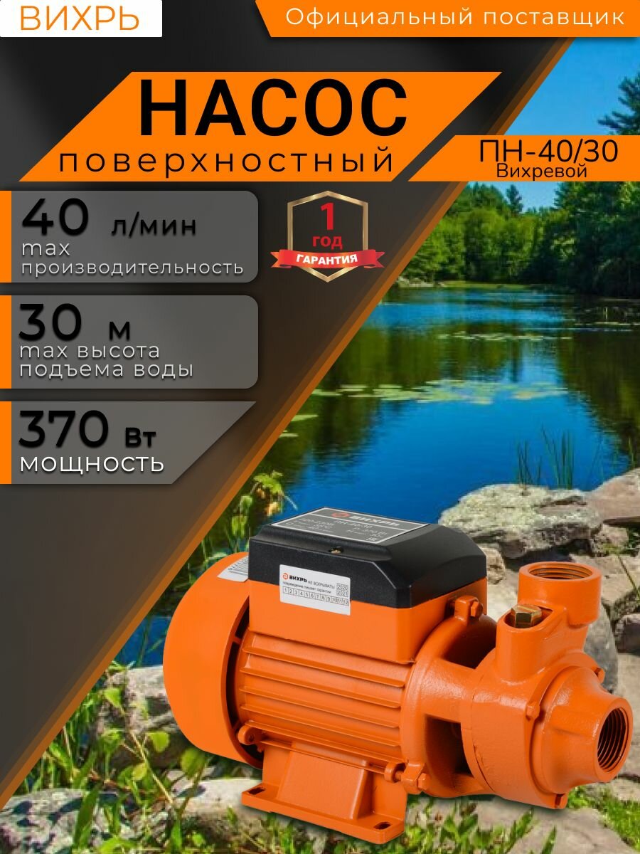 Поверхностный насос Вихрь ПН-40/30 , мощность 370Вт, для чистой воды, чугун, глубина до зеркала 30м