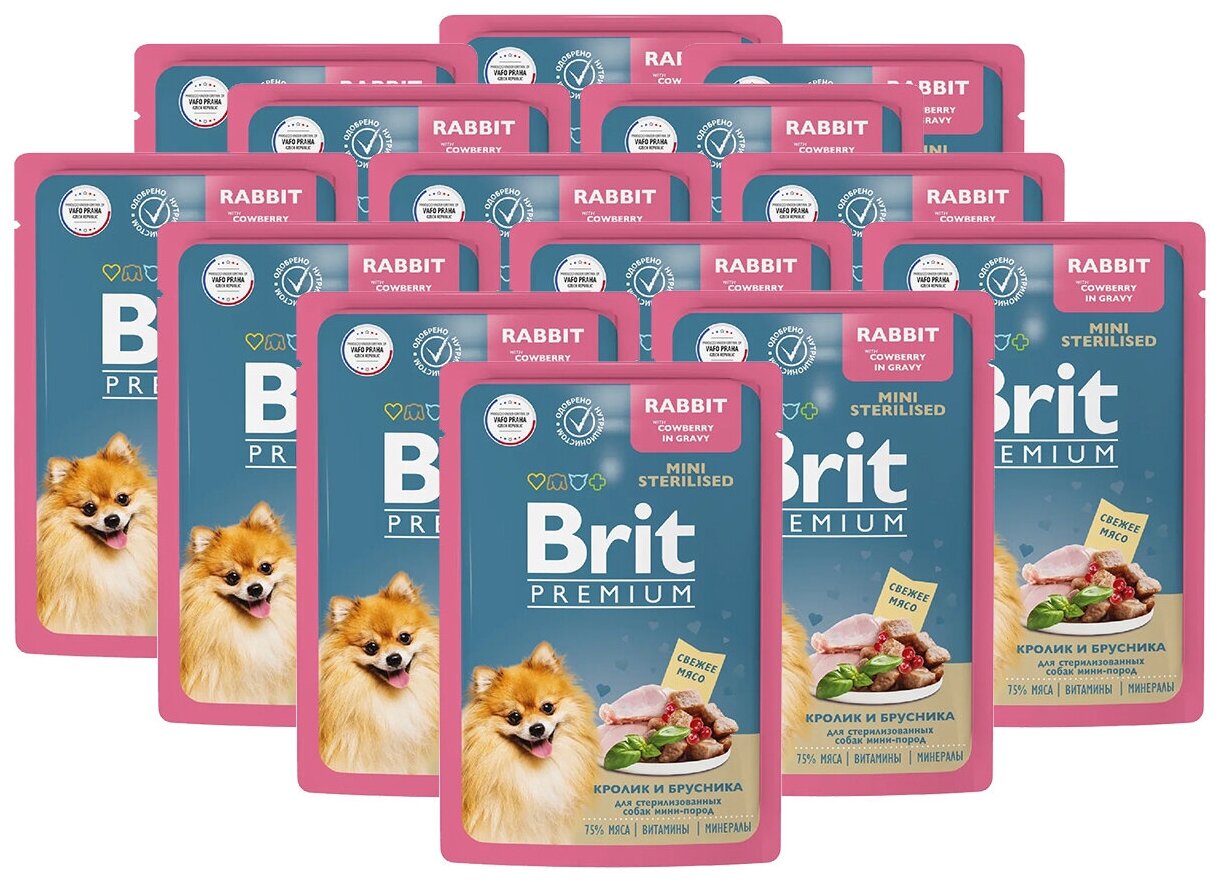 Влажный корм для собак Brit Premium для взрослых стерилизованных собак мини пород кролик и брусника в соусе, пауч 14 уп. х 85 г (для мелких пород)