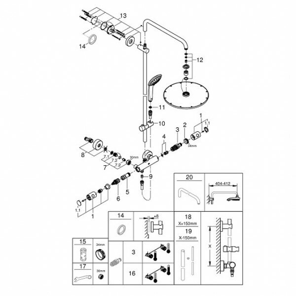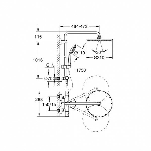 | Дополнительная информация | высота стойки для душа: 1132 мм; диаметр душевой лейки: 110 мм; диаметр верхнего душа: 310 мм; душевая струя верхнего душа Rain; 3 режима струи ручного душа: Rain, SmartRain, Massage; GROHE TurboStat встроенный термоэлемент; GROHE SafeStop стопор безопасности при 38°C; GROHE SafeStop Plus опционно ограничитель температуры на 43°C, включен; внутренний охлаждающий канал для продолжительного срока службы; система SpeedClean против известковых отложений; совместим с проточным водонагревателем только выше 18 кВ/ч, а также с накопительным водонагревателем |