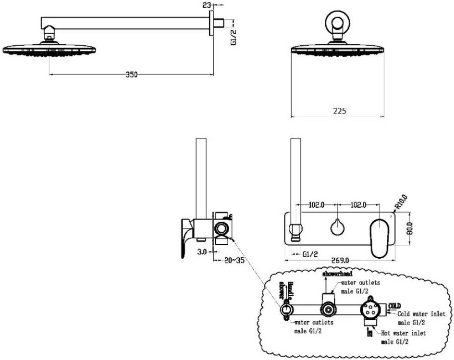 | Комплектация | Смеситель (внешняя и внутренняя части). Верхний душ. Ручной душ. Шланг для ручного душа. Держатель настенный. |