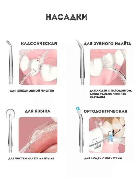 | Насадки | для струйной чистки / для чистки имплантов и коронок / для чистки языка / пародонтологическая (для десен) |