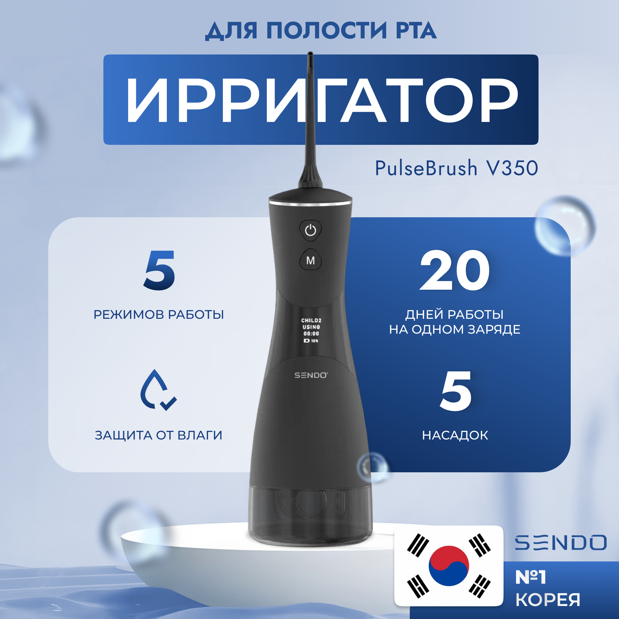 Ирригатор для полости рта SENDO PulseBrush V350 - черный + набор насадок