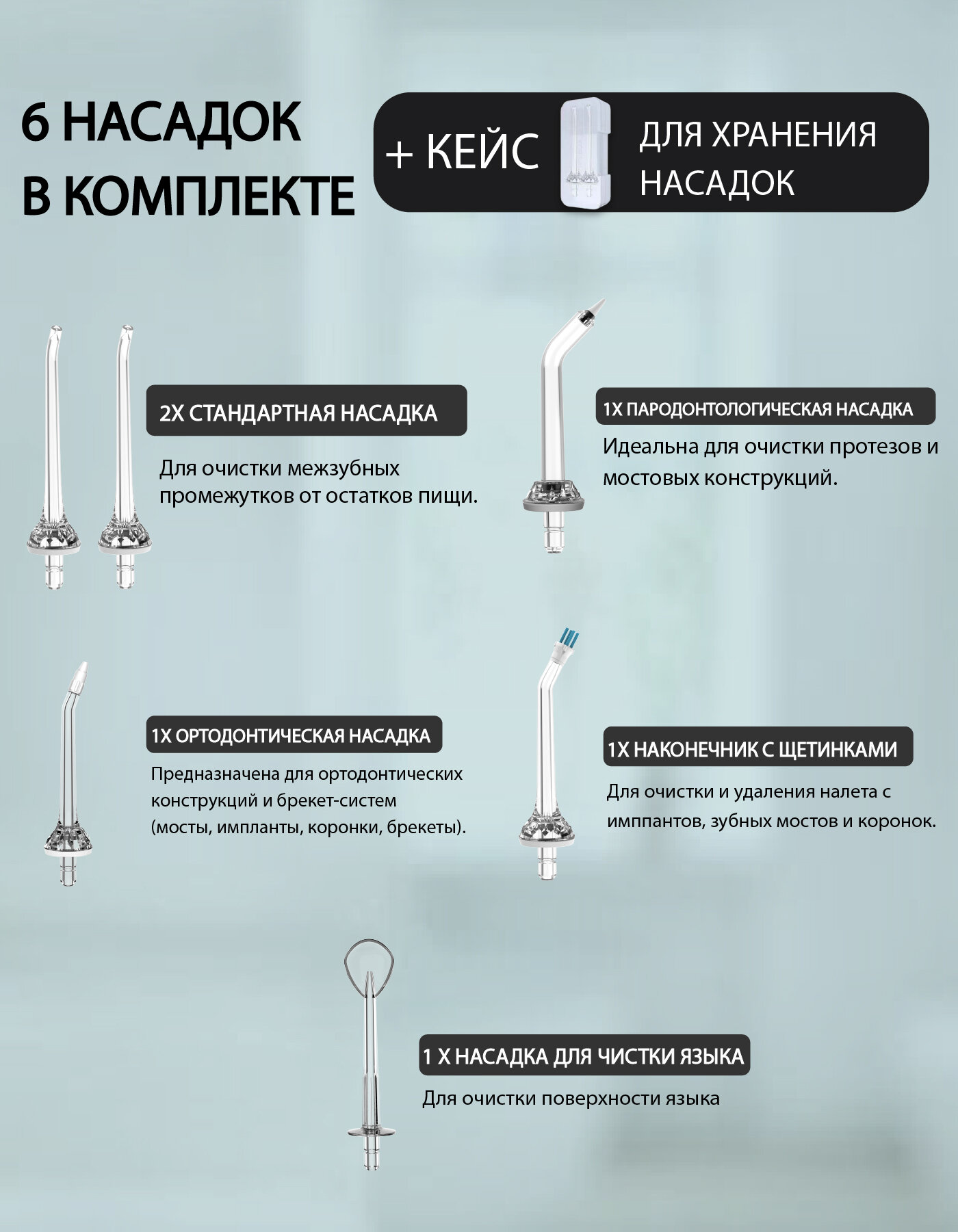 Разные насадки, что позволяет пользоваться им всей семьей. Просто каждый выбрал себе свою насадку и меняем их при использовании. Привыкали сначала просто с Водой Потом со спец раствором!