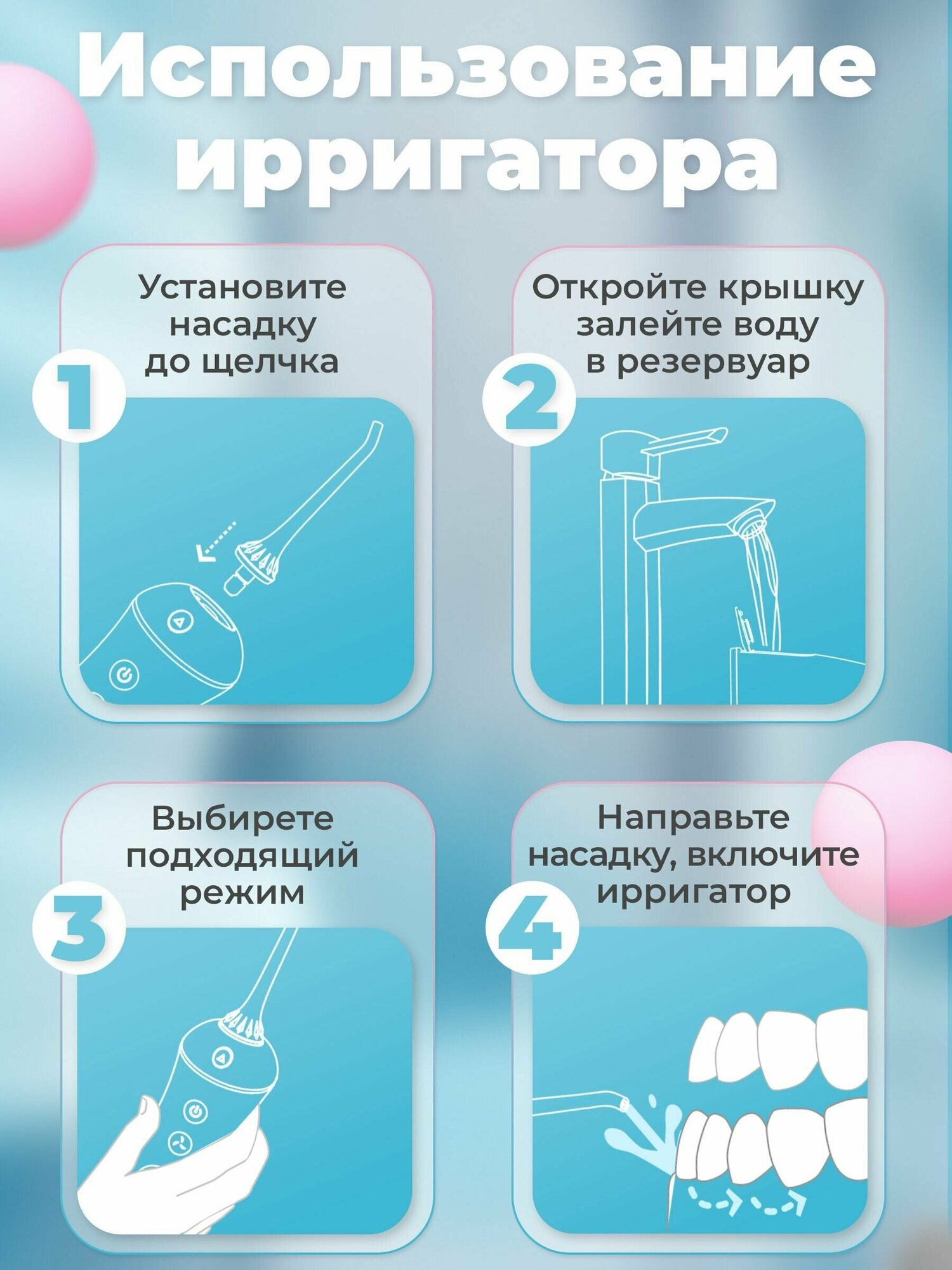 | Насадки | для струйной чистки / ортодонтическая (для брекетов) / пародонтологическая (для десен) |