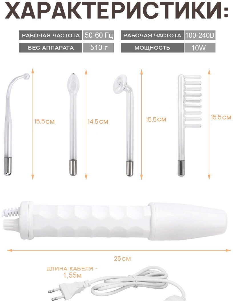 | Комплектация | высокочастотная рукоятка с проводом - 1шт; насадки - 4шт; инструкция на русском языке - 1шт |