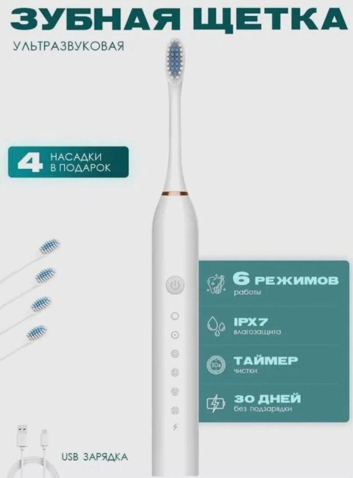 Ультразвуковая электрическая зубная щетка с 4 насадками и 6 уникальными режимами для взрослых и детей, цвет белый интересное: