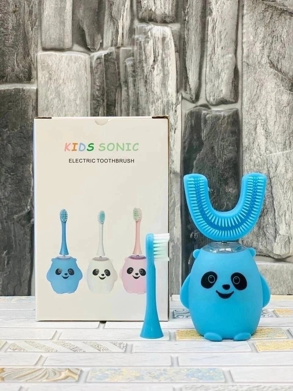Электрическая U-образная зубная щетка, 2 насадки панда, ультразвуковая щетка, для детей. Синий