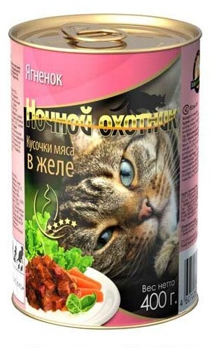 Ночной охотник влажный корм для взрослых кошек всех пород, ягненок, кусочки в желе 400 гр (10 шт)