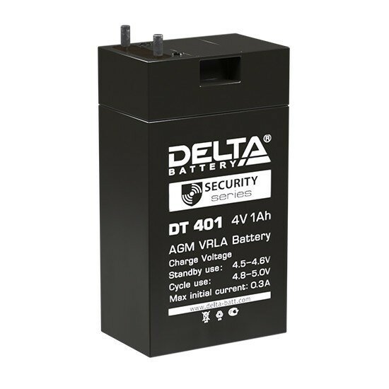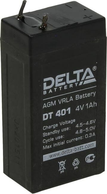 | Дополнительная информация | Аккумулятор Delta DT 401 полностью герметизирован, утечка из него электролита (кислоты) невозможна. Поэтому его можно транспортировать и использовать в любом удобном положении (вертикальном или горизонтальном). У батареи DT 401 отсутствуют ограничения на перевозку по автомобильным дорогам, по воздуху, по морю и по железной дороге |