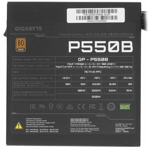 Блок питания ATX GIGABYTE GP-P550B 550W, Active PFC, 120mm fan, 8 0 PLUS Bronze