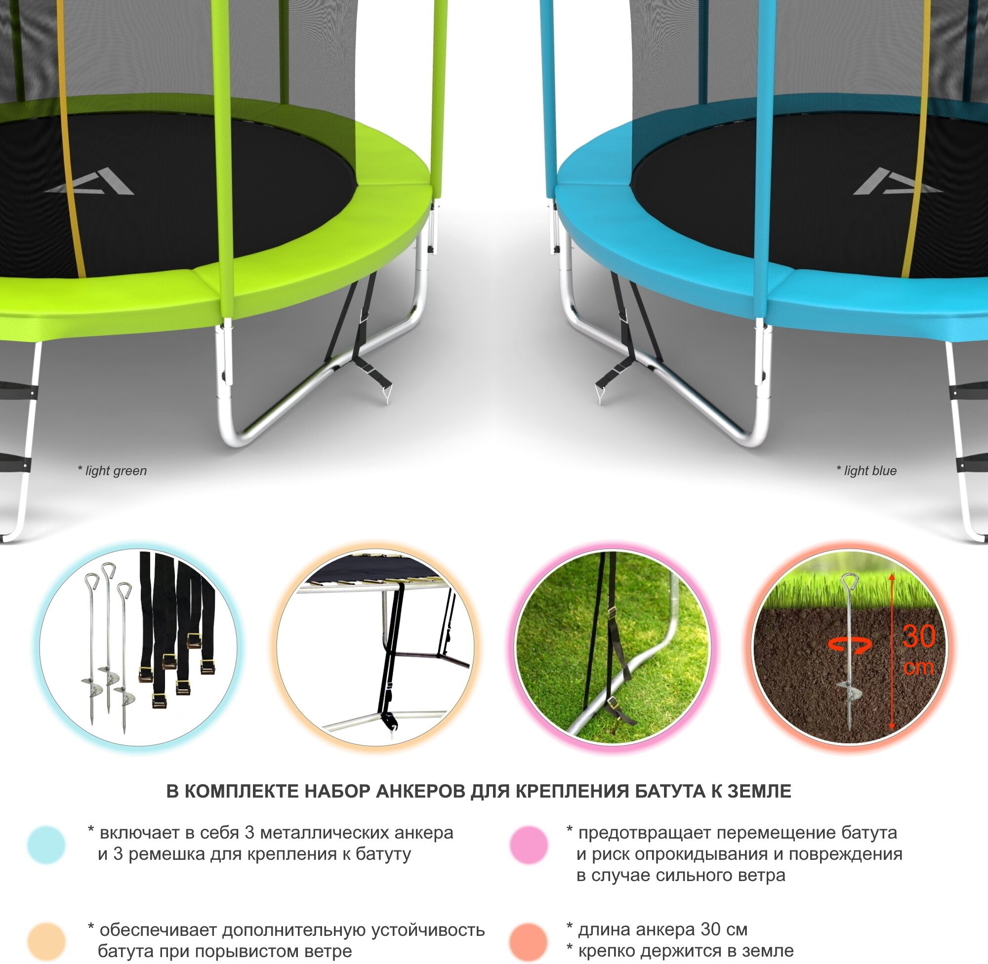 | Состав набора | Каркас батута, прыжковое полотно, комплект пружин, защитный мат, верхняя защитная сетка, лестница, набор анкеров для крепления батута к земле, ключ для установки пружин, набор инструментов и крепежей, инструкция по сборке и эксплуатации на русском языке |