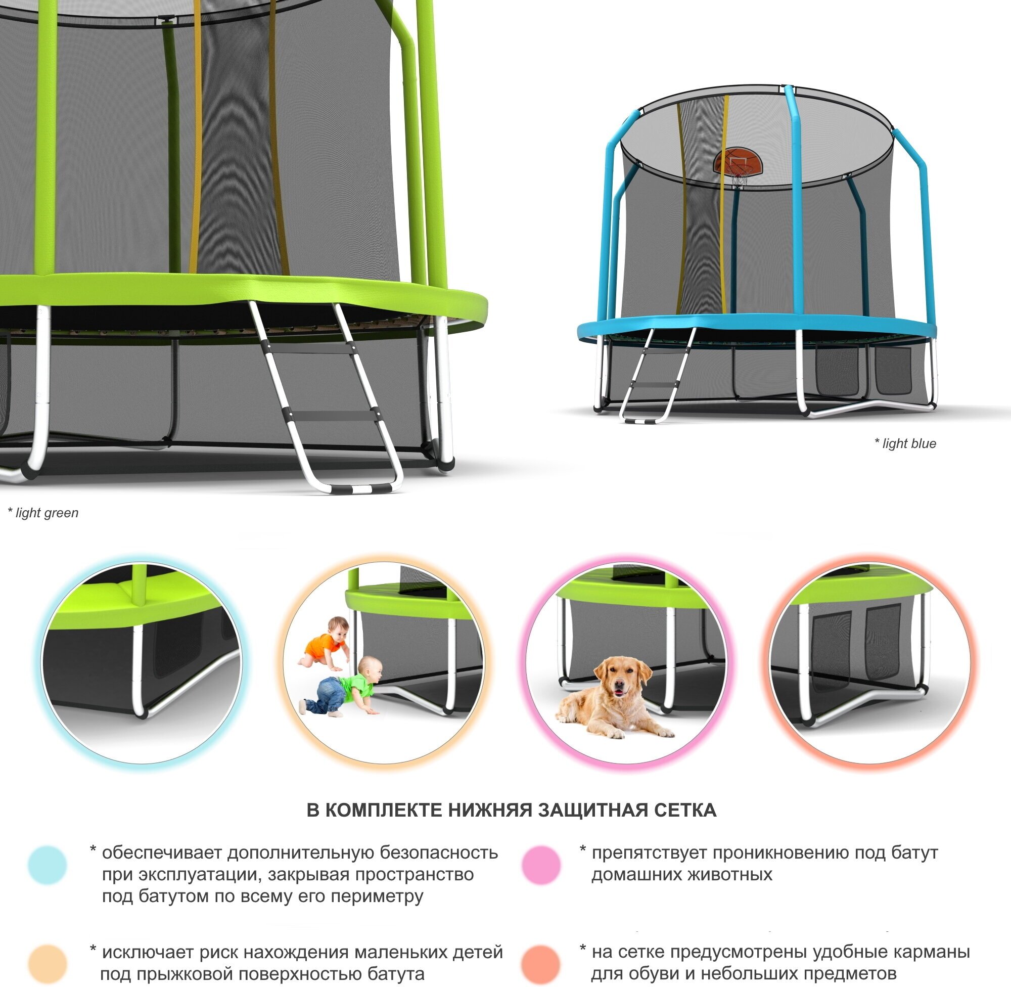 | Особенности | W-образные опоры / баскетбольное кольцо / защита пружин / нижняя защитная сетка / с защитной сеткой / с лестницей |