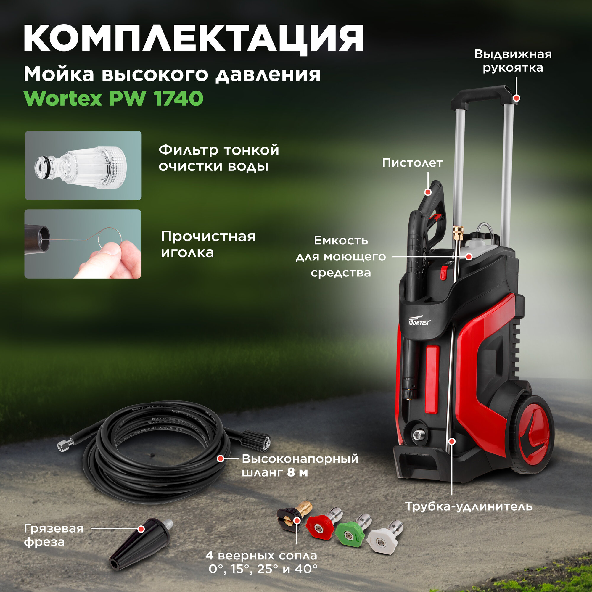 Очиститель высокого давления WORTEX PW 1740 2.40 кВт, 170 бар, 510 л/ч (мойка высокого давления, автомойка, ф-ция самовсасывания, шланг 8 м, 4 веерных