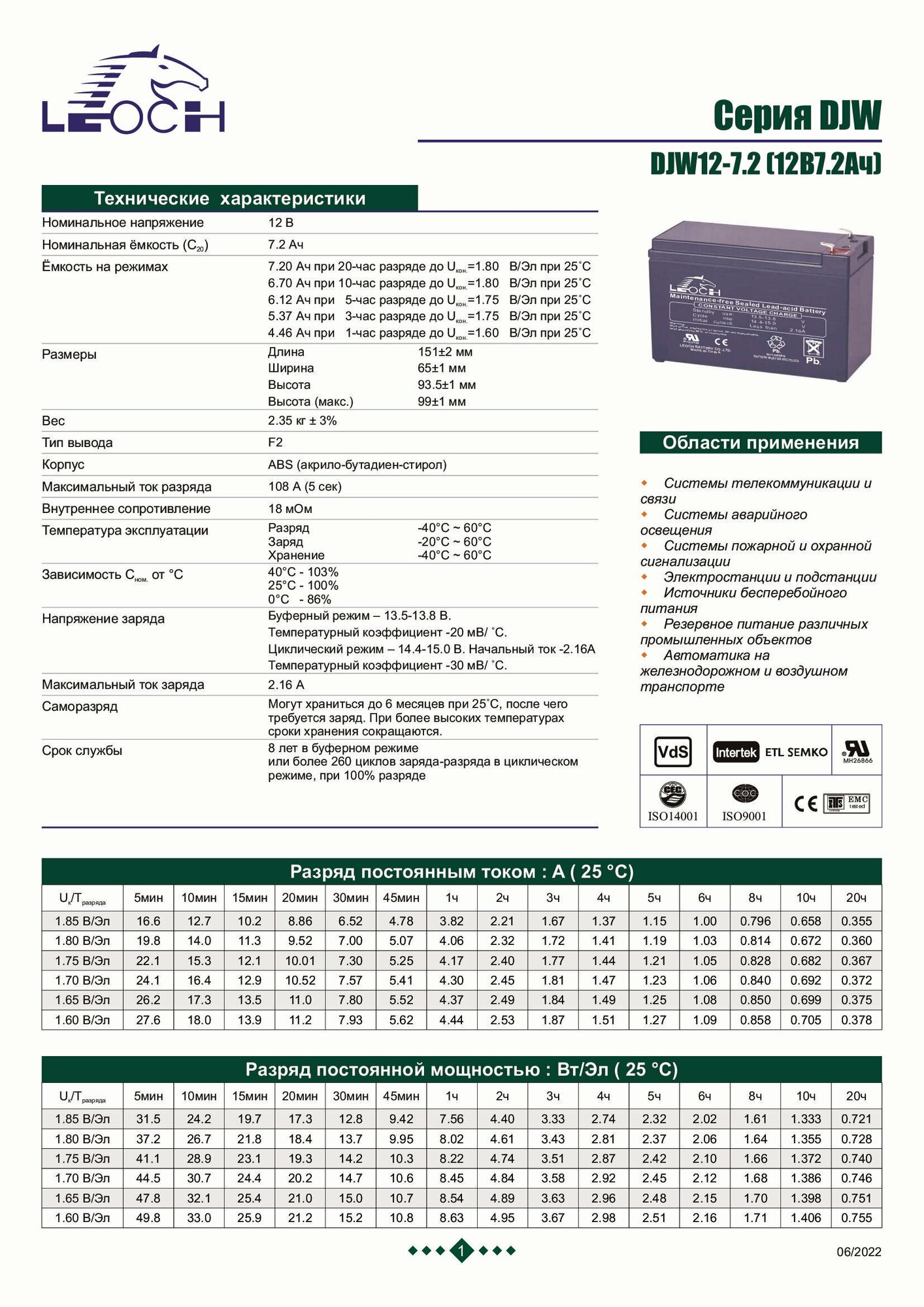 Аккумуляторная батарея LEOCH DJW12-7.2 интересное: