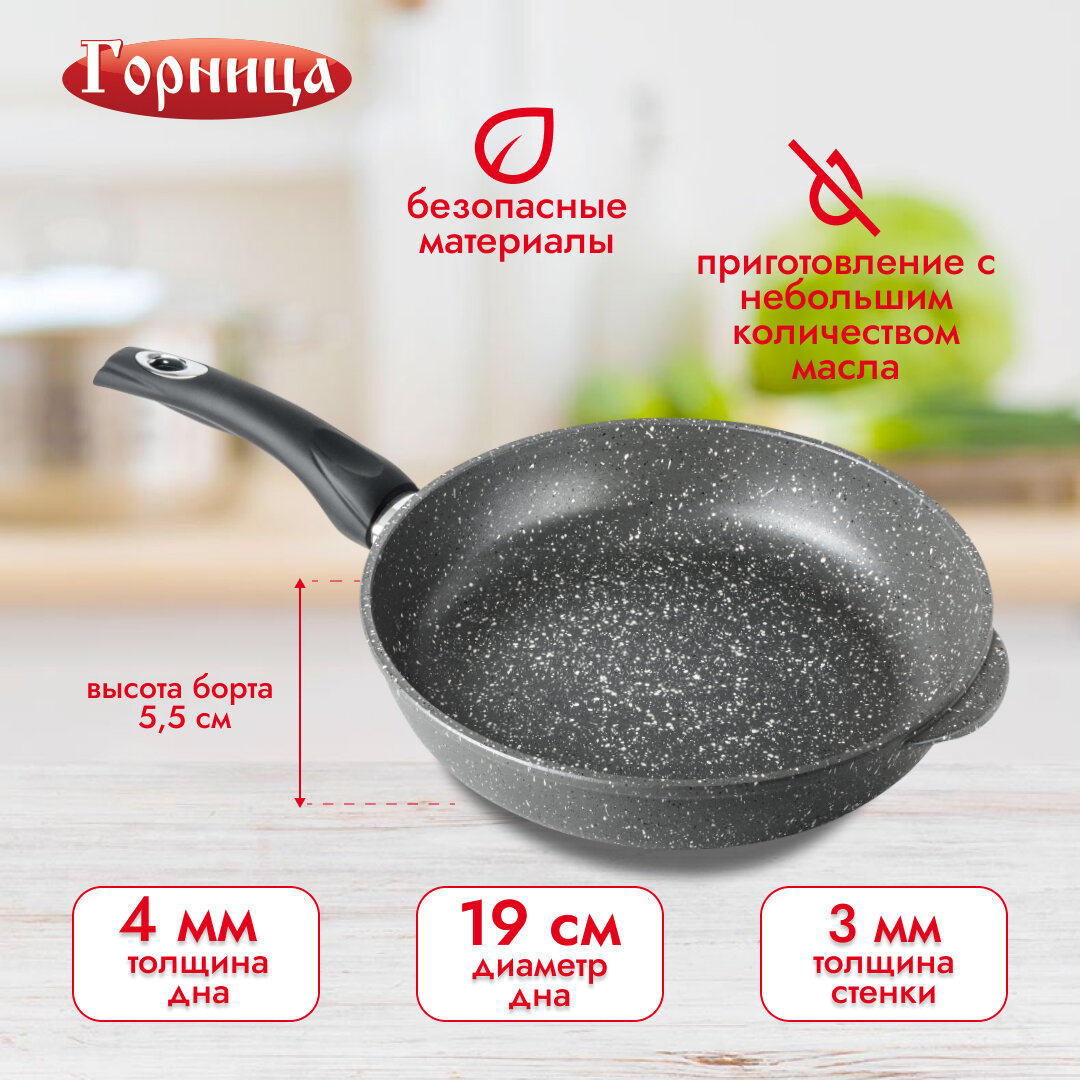 Сковорода серия "Графит" диаметр 24 см высота 5,5 см с пластиковой несъемной ручкой без крышки антипригарное покрытие цвет темный мрамор интересное: