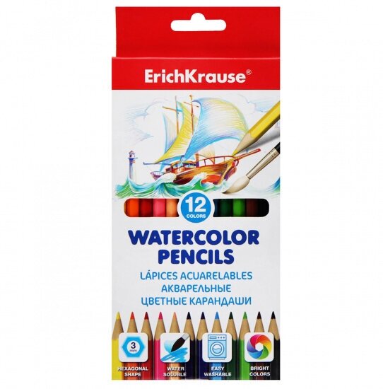 Купить Цветные карандаши ErichKrause 12 цветов акварельные шестигранные с кисточкой 50533ЕК