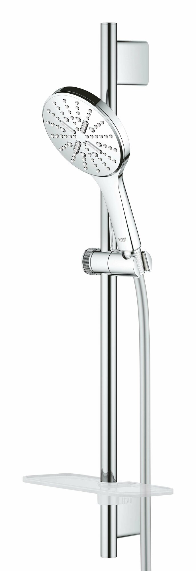 | Комплектация | ручной душ Rainshower SmartActive 130 (26 574) / душевая штанга 600 мм с металлическими настенными креплениями / душевой шланг 1750 мм (28 388 000) / Полочка GROHE EasyReach |