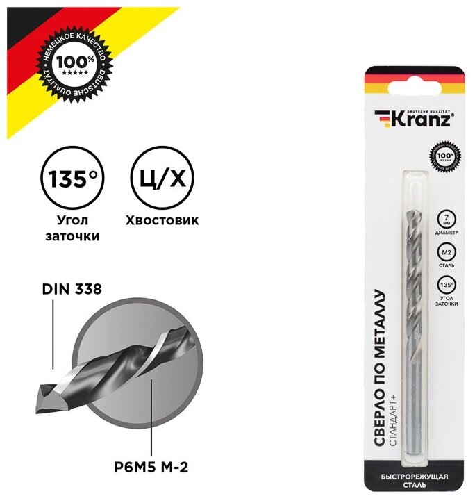 Сверло по металлу KRANZ 7 мм Стандарт+ из быстрорежущей стали P6M5 M-2, в упаковке 1 шт., стандарт DIN 338