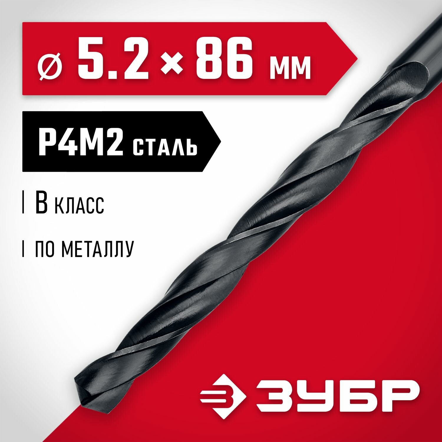 ЗУБР мастер 5.2х86мм, Сверло по металлу, сталь Р4М2, класс В, 29605-5.2