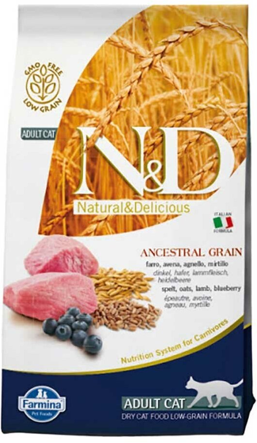 Корм сухой Farmina N&D ANCESTRAL GRAIN CAT, для взрослых кошек, ягненок, спельта, овес и черника, 1.5 кг