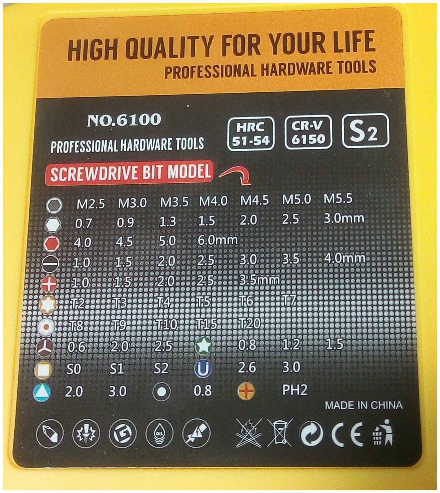 | Биты подробно | • 7x Гайки: M2.5, M3.0, M3.5, M4.0, M4.5, M5, M5.5;11x Шестигранные: 0,7 мм, 0,9 мм, 1,3 мм, 1,5 мм, 2,0 мм, 2,5 мм, 3,0 мм, 4,0 мм, 4,5 мм, 5,0 мм, 6,0 мм;7 x Плоские головки: 1,0 мм, 1,5 мм, 2,0 мм, 2,5 мм, 3,0 мм, 3,5 мм, 4,0 мм;• 5 x Phillips: 1,0 мм, 1,5 мм, 2,0 мм, 2,5 мм, 3,5 мм• 11x Torx: T2, T3, T4, T5, T6, T7, T8, T9, T10, T15, T20• 3x "Y" отвертки: 0,6, 2,0, 2,5• 3x Pentalobe:0.8,1,2, 1,5• 3x Квадратные размеры: S0, S1, S2• 2x "U" размеры: 2,6, 3,0; • 2x треугольника: 2.0, 3.0 • 1x Размер кросс: PH2 |
