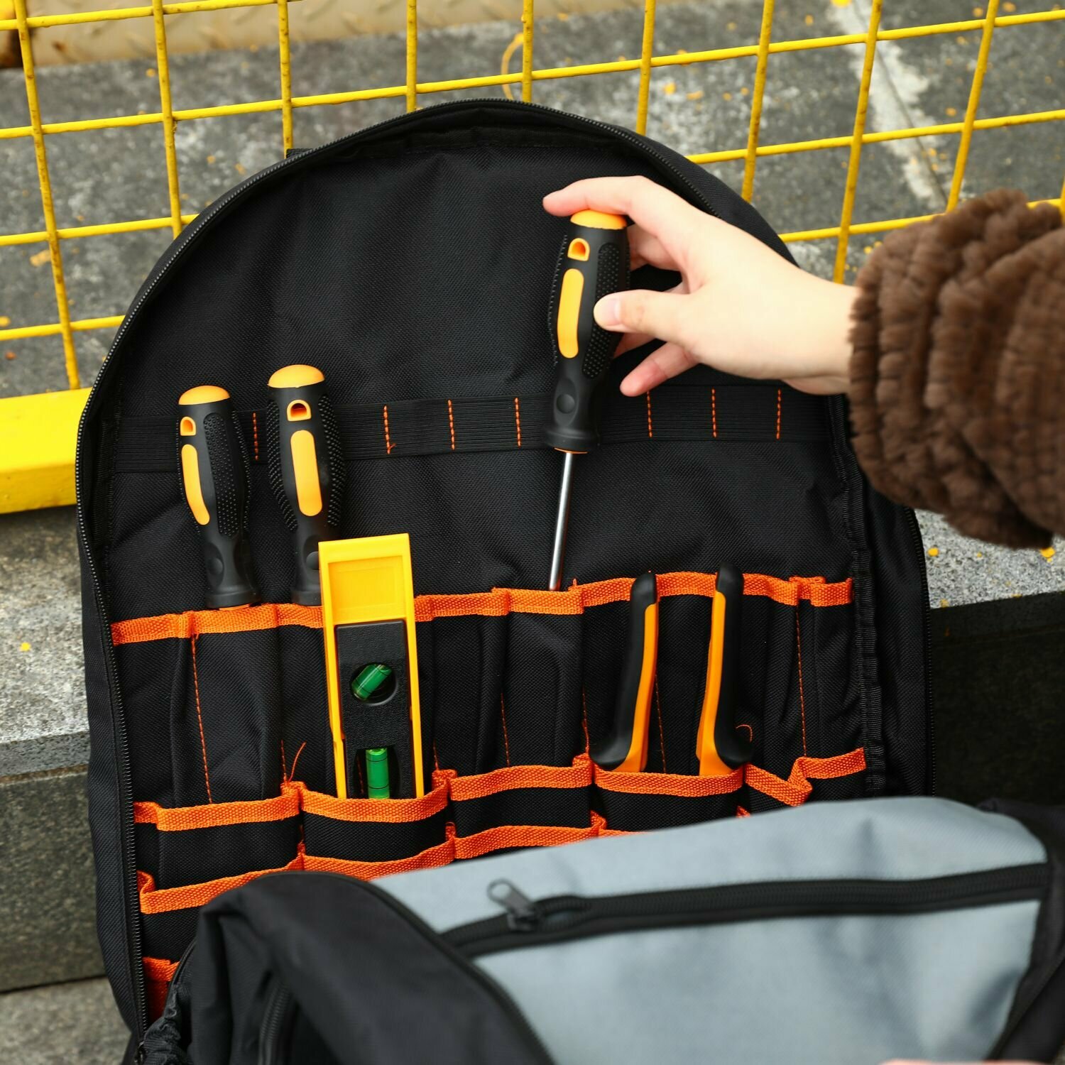| Отзыв: | За свою цену хороший рюкзак, достаточно вместительный, спина за целый день работы не устает, но из недостатков стоит отметить маленькие кармашки, в которые габаритный инструмент типа молотка или крупных ключей не влезет или будет постоянно выпадать. Так же из за мягкой спинки неудобно убирать инструмент на место после производства работ, она постоянно сворачивается и поэтому приходится открывать рюкзак полностью, чтобы аккуратно сложить инструмент. |