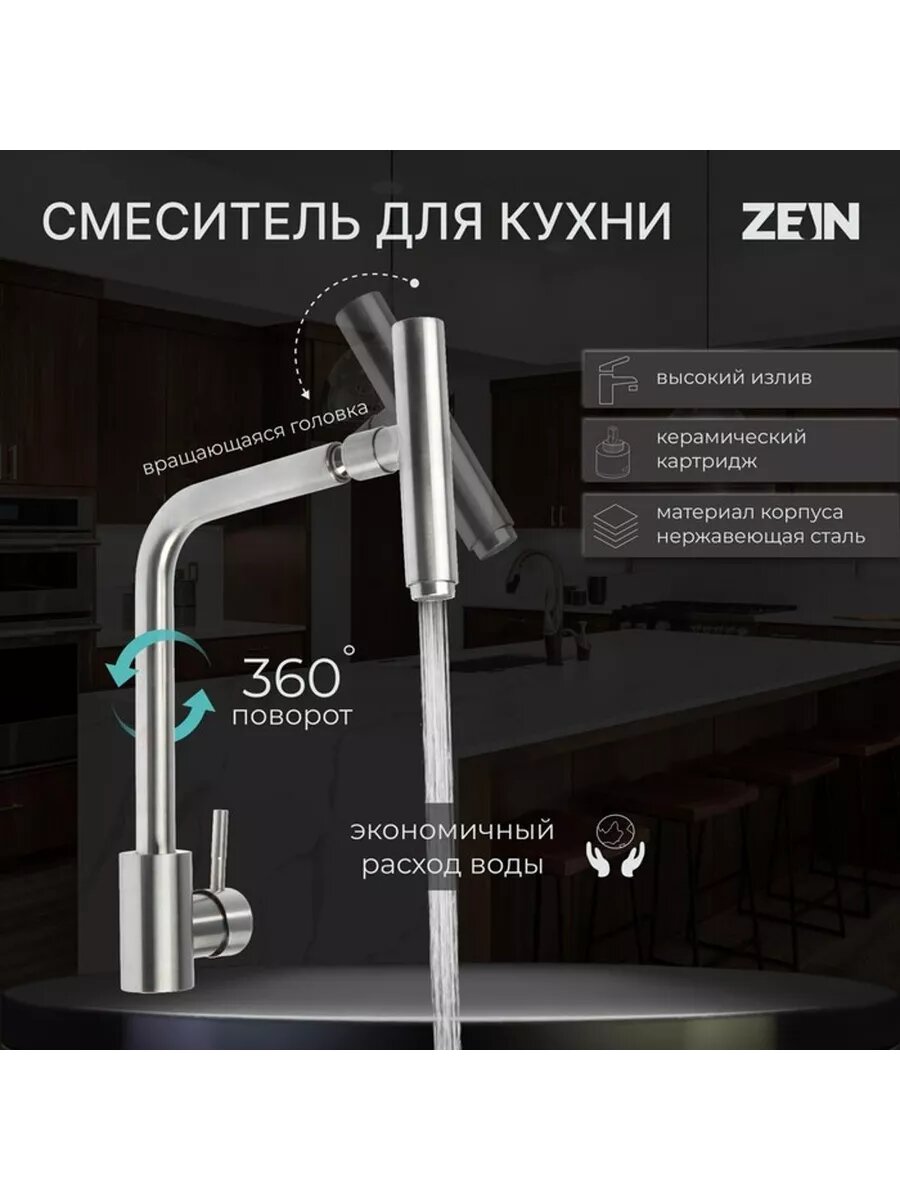 Смеситель для кухни Zein Zs-1, "микрофон", картридж 35 мм, нержавеющая сталь, сатин Zein 7603398 . интересное: