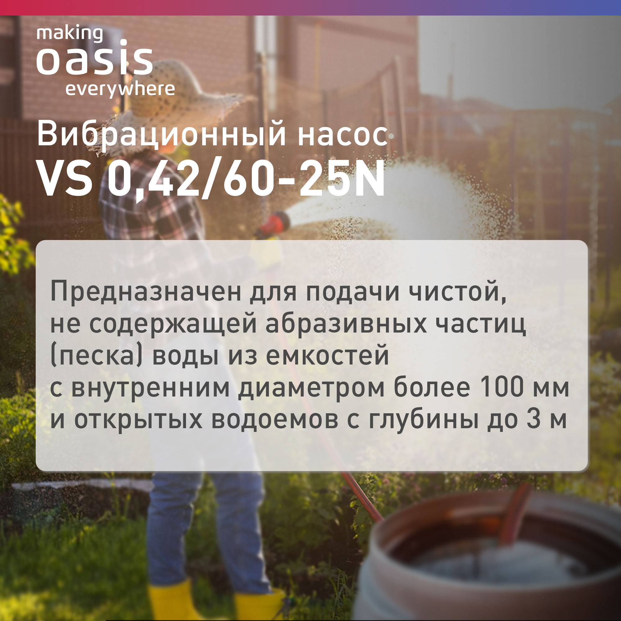 Насос вибрационный, Oasis, верхний забор, 25 м, 250 Вт, глубина погружения 3 м, максимальный напор 60 м, 1.5 м3/час, VS 0.42/60