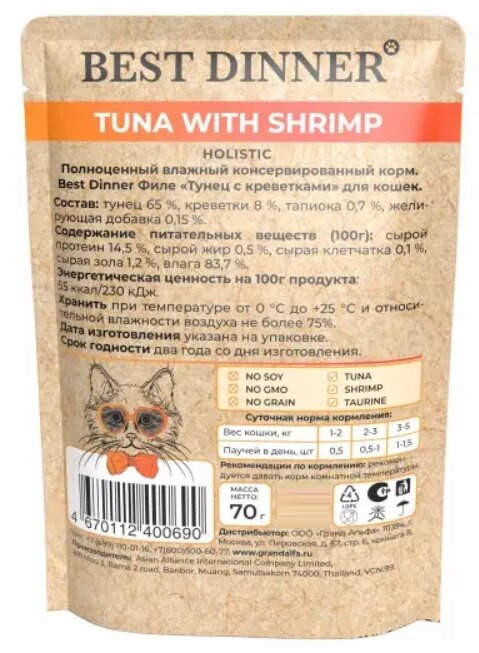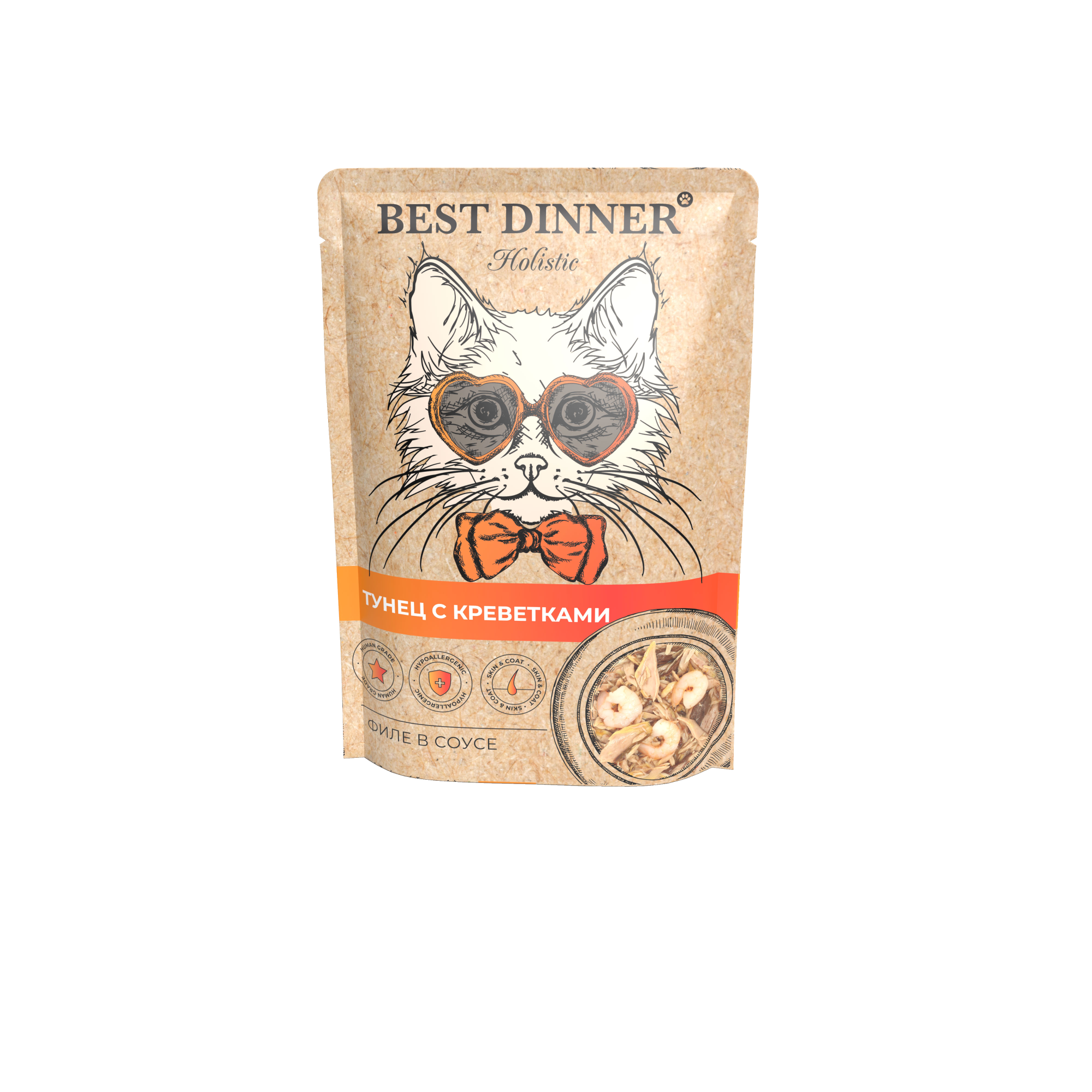 Корм влажный для кошек и котят Бест Диннер (Best DInner) Холистик мясо филе тунца с креветками в соусе, пауч (18шт*70гр)
