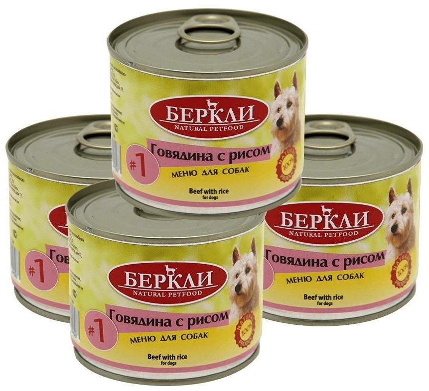 Консервы для собак Беркли №1 говядина с рисом 200г х 4шт.