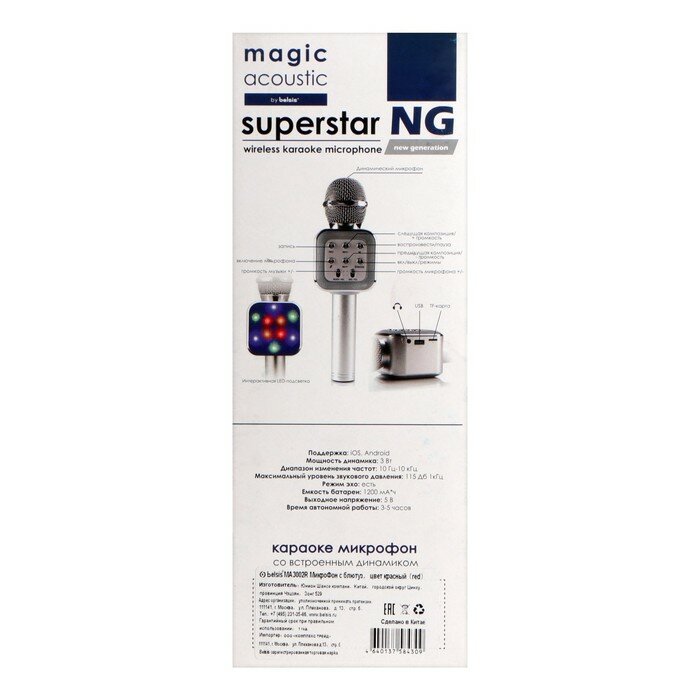 Микрофон для караоке Belsis MA3002BK, 3 Вт, 1200 мАч, Bluetooth, FM, microSD, красный интересное: