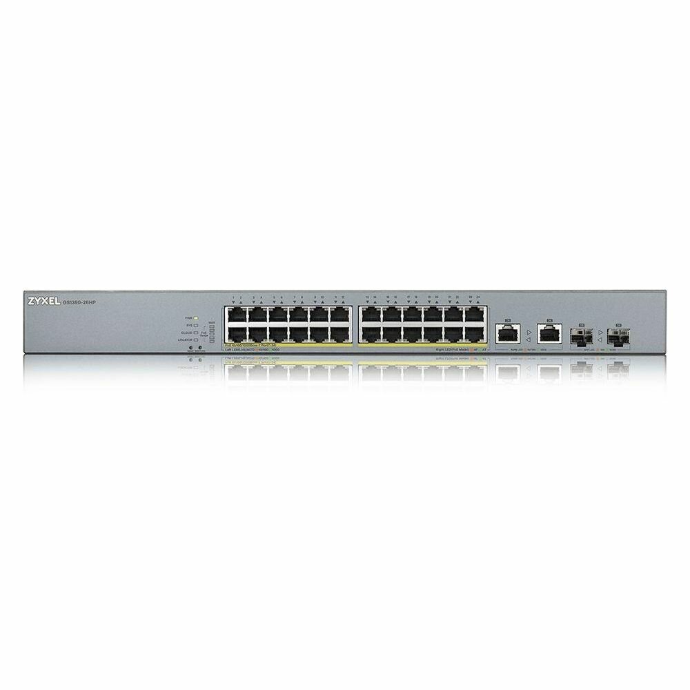 ZyXEL Коммутатор ZYXEL GS1350-26HP L2 PoE + switch for IP cameras, 24xGE PoE +, 2xCombo (SFP / RJ-45), PoE budget 375 W, power transfer distance up to 250 m, auto-reloading of PoE ports, increased overvoltage and electrostatic discharge protection
