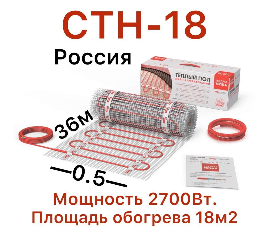 СохранитьНагревательный мат, СТН, Квадрат тепла КМ-2700-18,0 150 Вт/м2 с программируемым терморегулятором, 18,0 м2, 3600х50 см интересное: