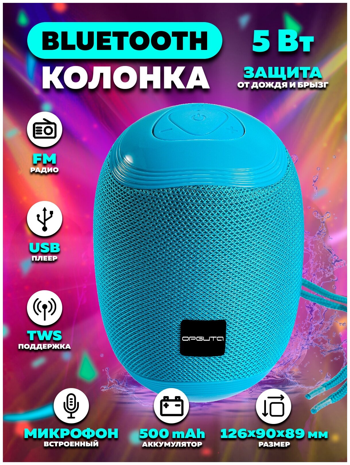 Колонка Bluetooth, FM радио, USB плеер, защита от воды, ткань OT-SPB127синяя Орбита