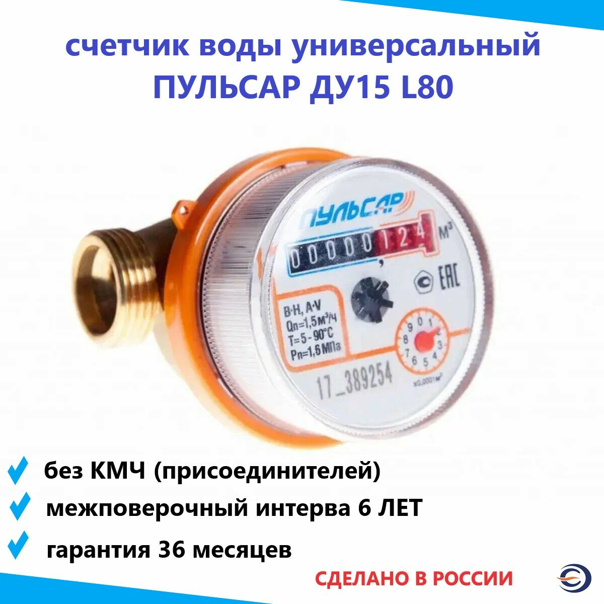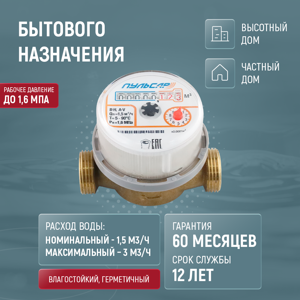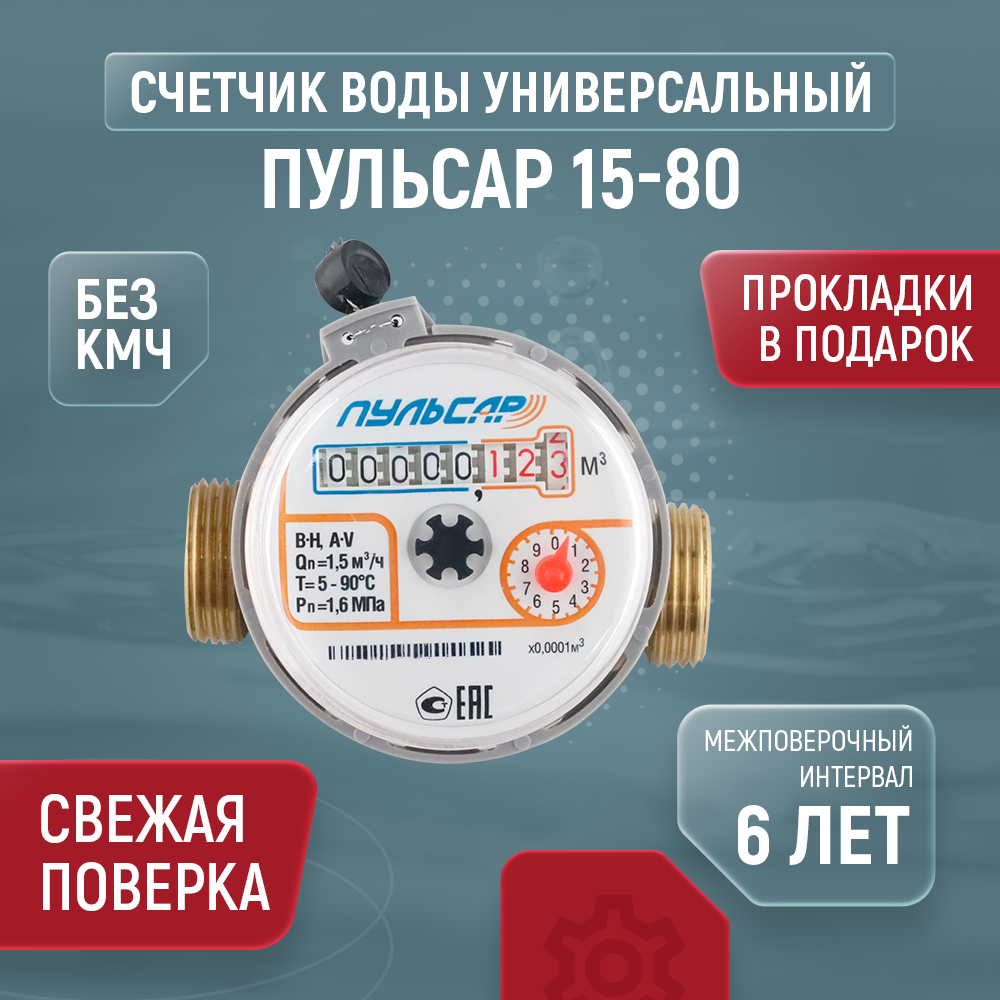 Счетчик воды Пульсар универсальный Ду-15;Qn=1,5 м3/час; L=80мм; (без присоединителей); МПИ 6 лет