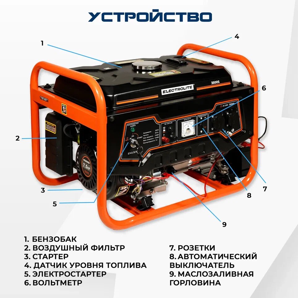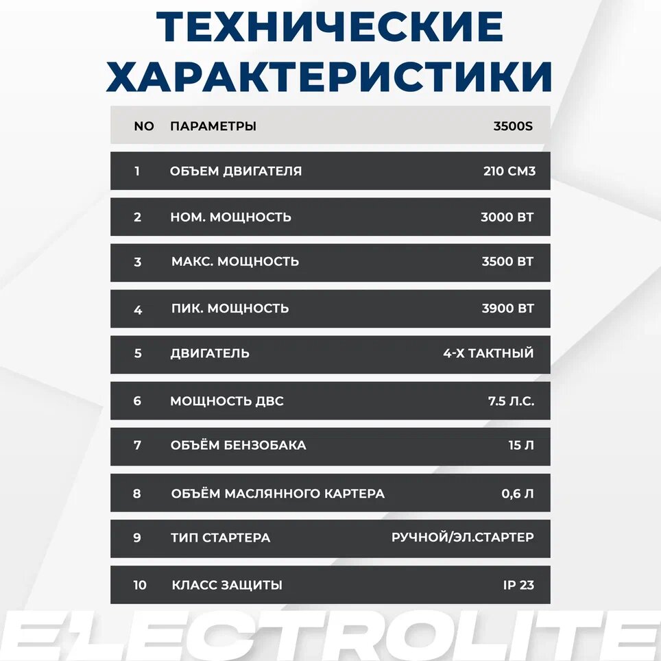 Electrolite Генератор бензиновый 3500S EL с электростартером ( 4.4 кВа максимальная нагрузка , 220 В / 12 В, 3 / 3,5 кВт, 7.5 л.с, электростартер + АКБ ) 5568