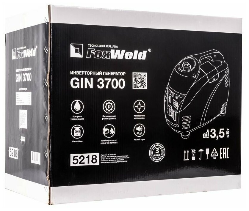 Генератор инверторный FoxWeld GIN 3700 бензиновый, 3.5 кВт, 29.5 кг, без колёс