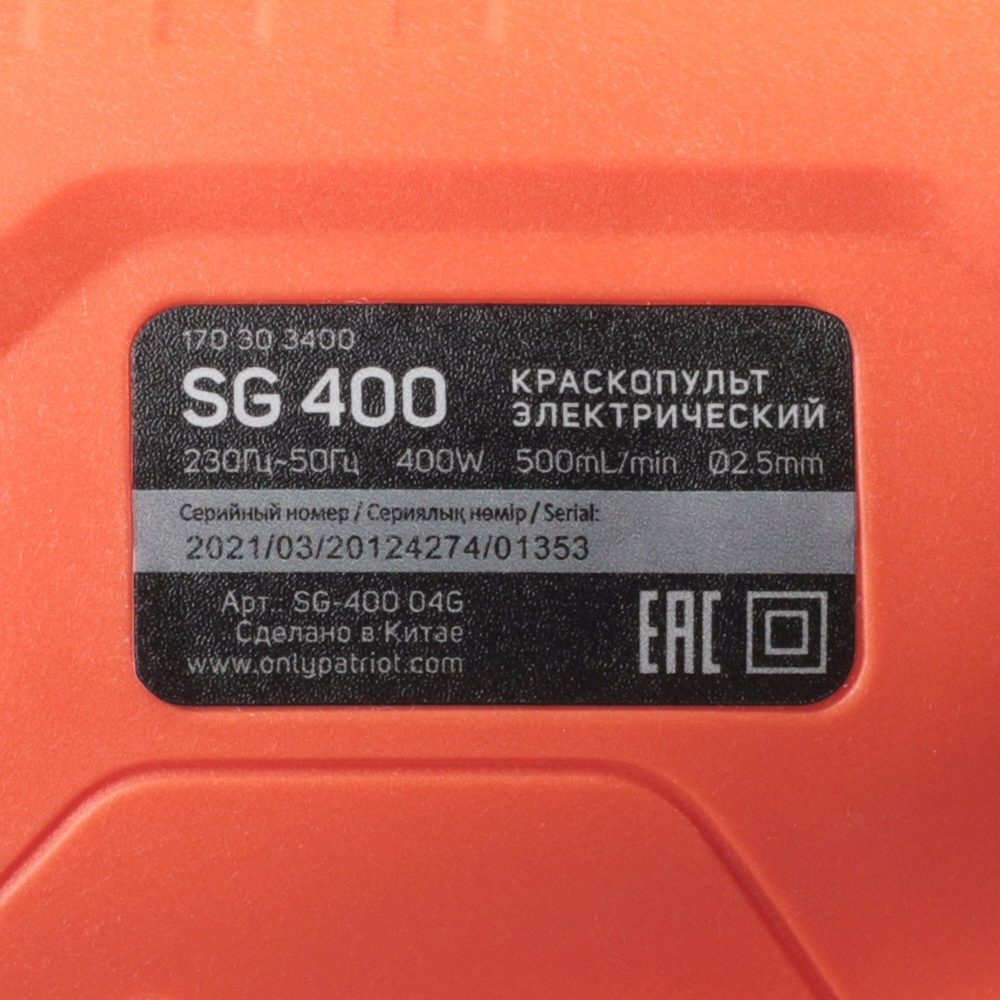 Краскопульт электрический PATRIOT SG 400, 400Вт, 500 мл/мин., Сопло: 2,5 мм.