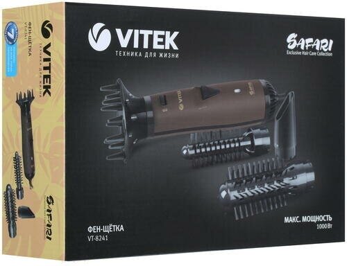 Фен-щетка Vitek VT-8241 коричневый/черный, коричневый/черный, 1000 Вт, диаметр - 20 мм, 33 мм, насадок - 4 шт, шнур - 1.8 м
