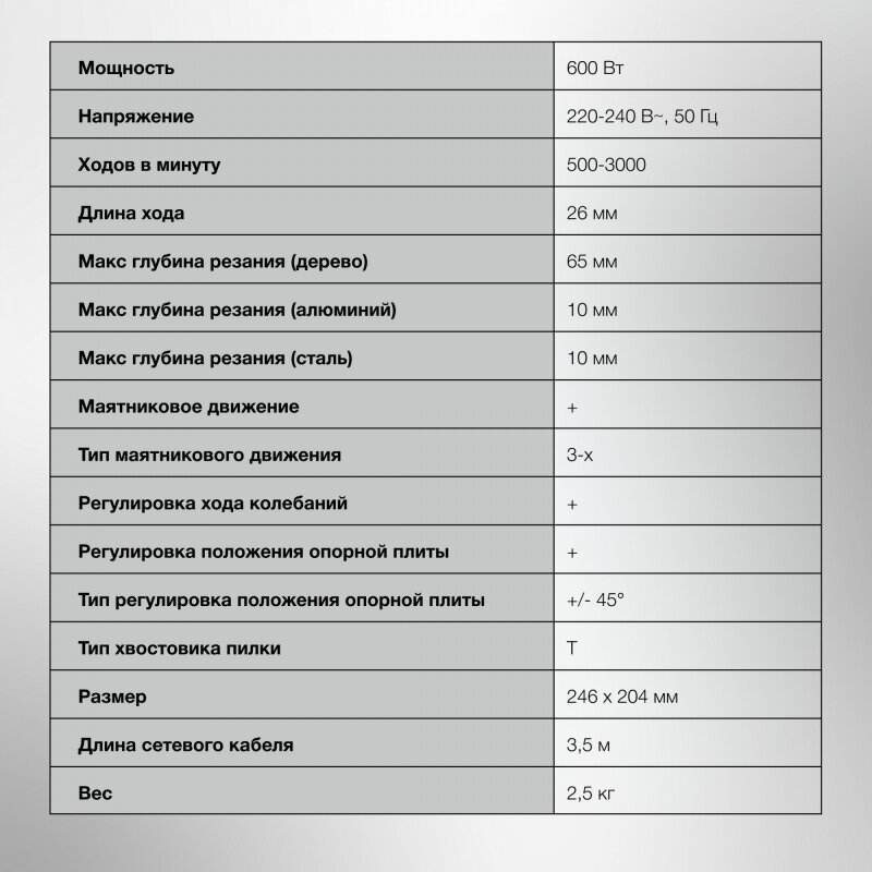 Регулировка скорости. Маятник позволяет делать рез аккуратнее и быстрее. Длинный кабель 3 метра, работать комфортно. |