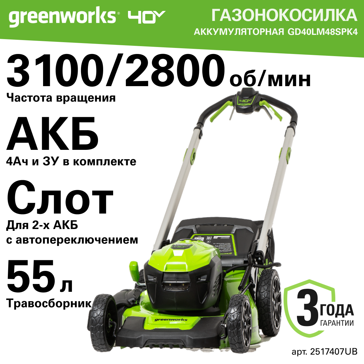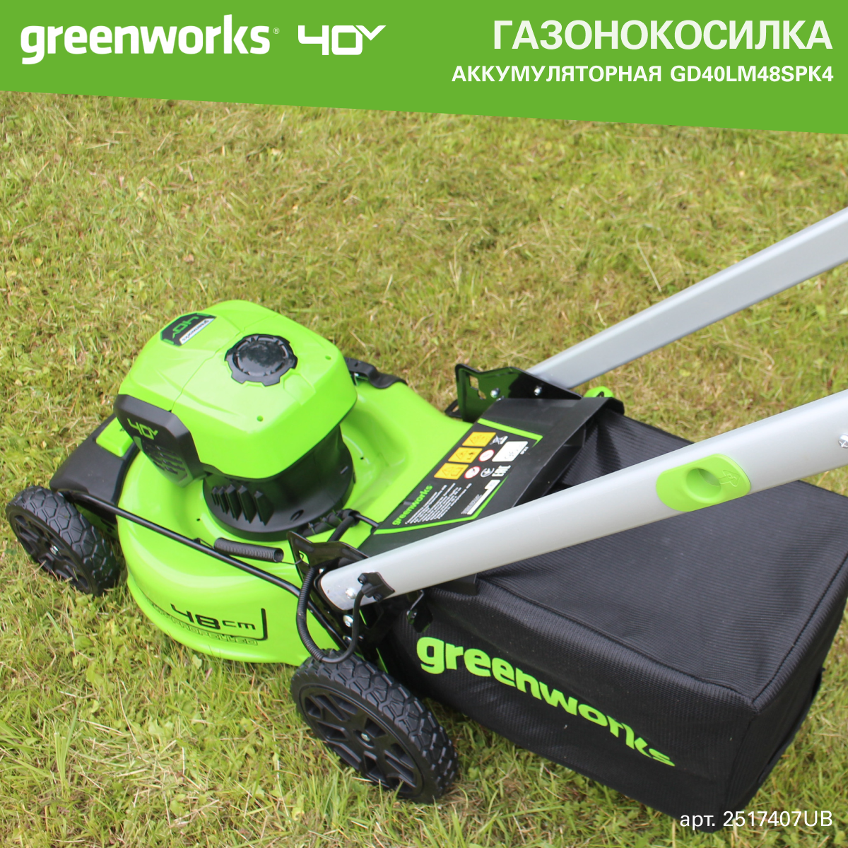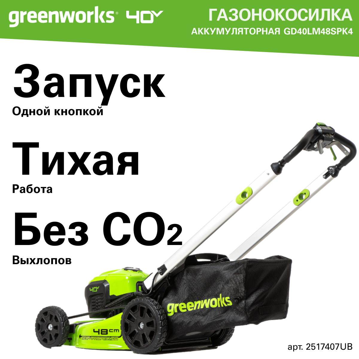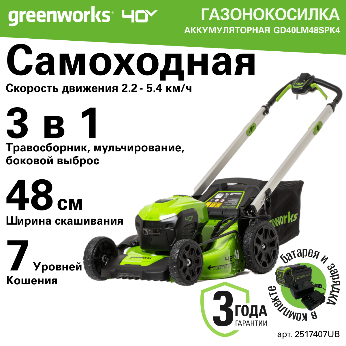 Газонокосилка аккумуляторная Greenworks Арт. 2517407UB, 40V, 48 см, самоходная, бесщеточная, c 1хАКБ 4 Ач и ЗУ