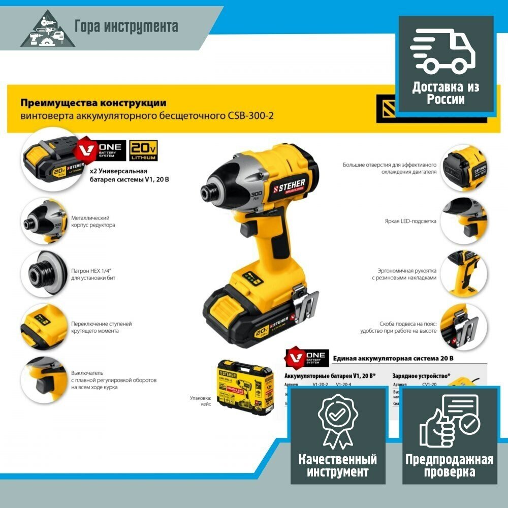 STEHER V1, 20 В, 300 Н·м, 2 АКБ (2 А·ч), бесщеточный винтоверт, кейс (CSB-300-2)