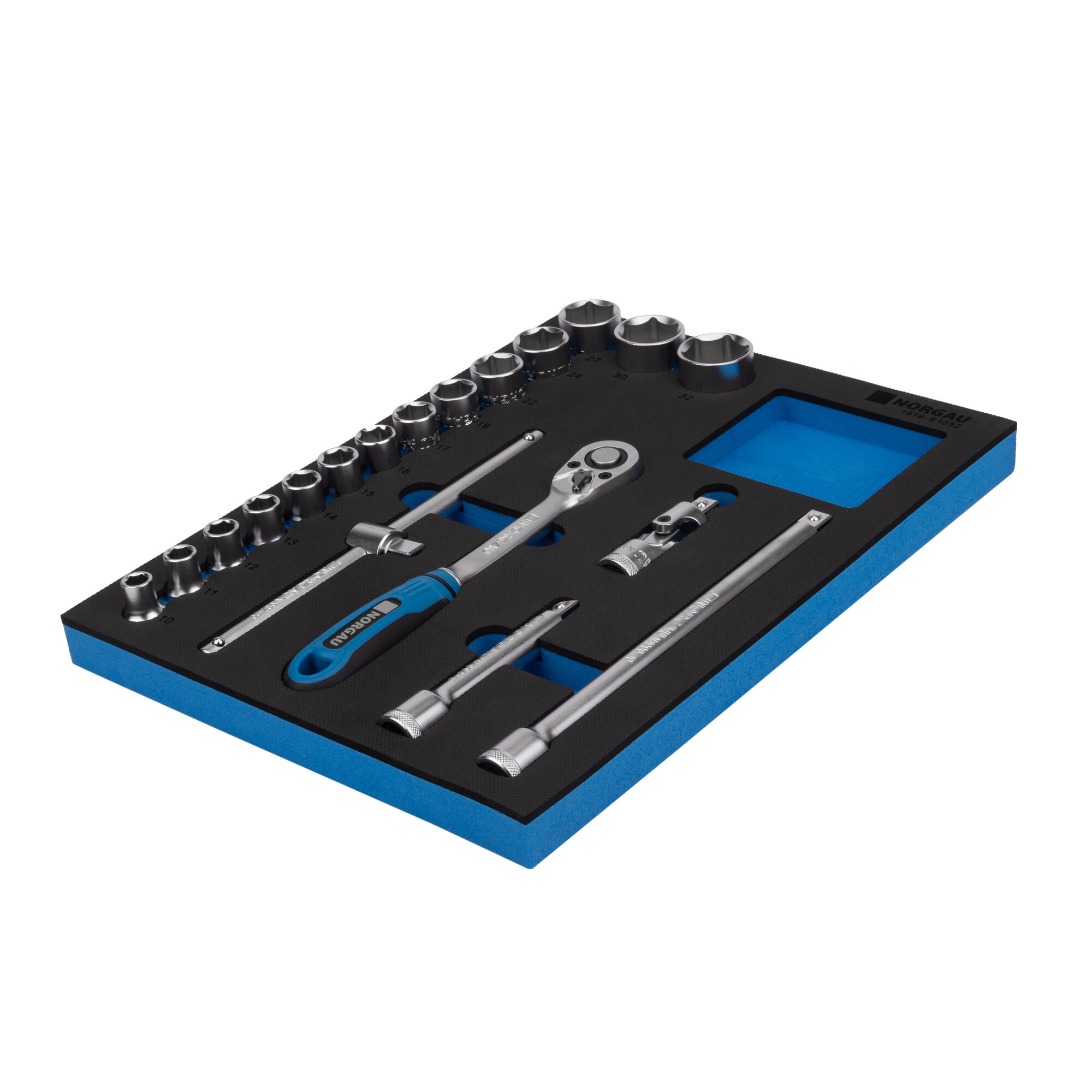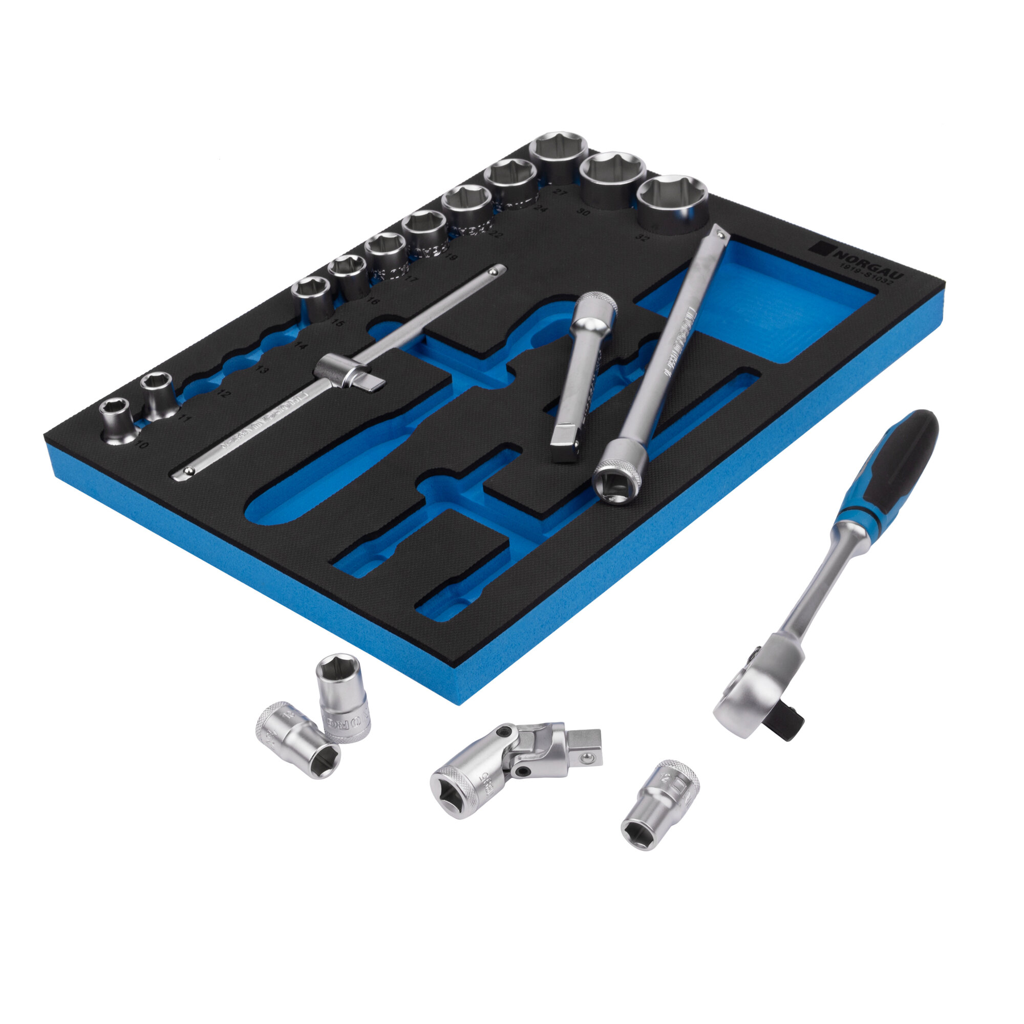 Набор 12-гранных торцевых головок NORGAU Industrial (10 - 32 мм) под квадрат 1/2” с трещоткой, 19 предметов