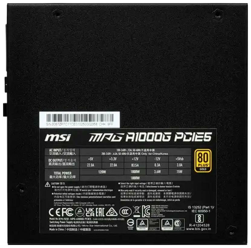 Блок питания MSI MPG A1000G PCIE5 1000W (306-7ZP7C11-CE0) черный - 80+ Gold, ATX 20+4 пин, 4 pin + 4 pin x2 CPU, 12 SATA, 12vhpwr (12+4pin) PCI-E