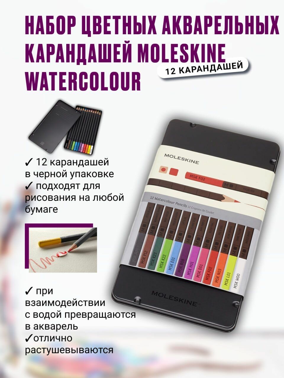Карандаши цветные Moleskine WATERCOLOUR EW7P12COLA акварельные 12 цветов металлическая коробка
