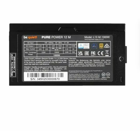 be quiet! Pure Power 12 M 1000W / ATX 3.0, 80 PLUS Gold, LLC+SR+DC-DC, 120mm fan, semi-modular / BN345