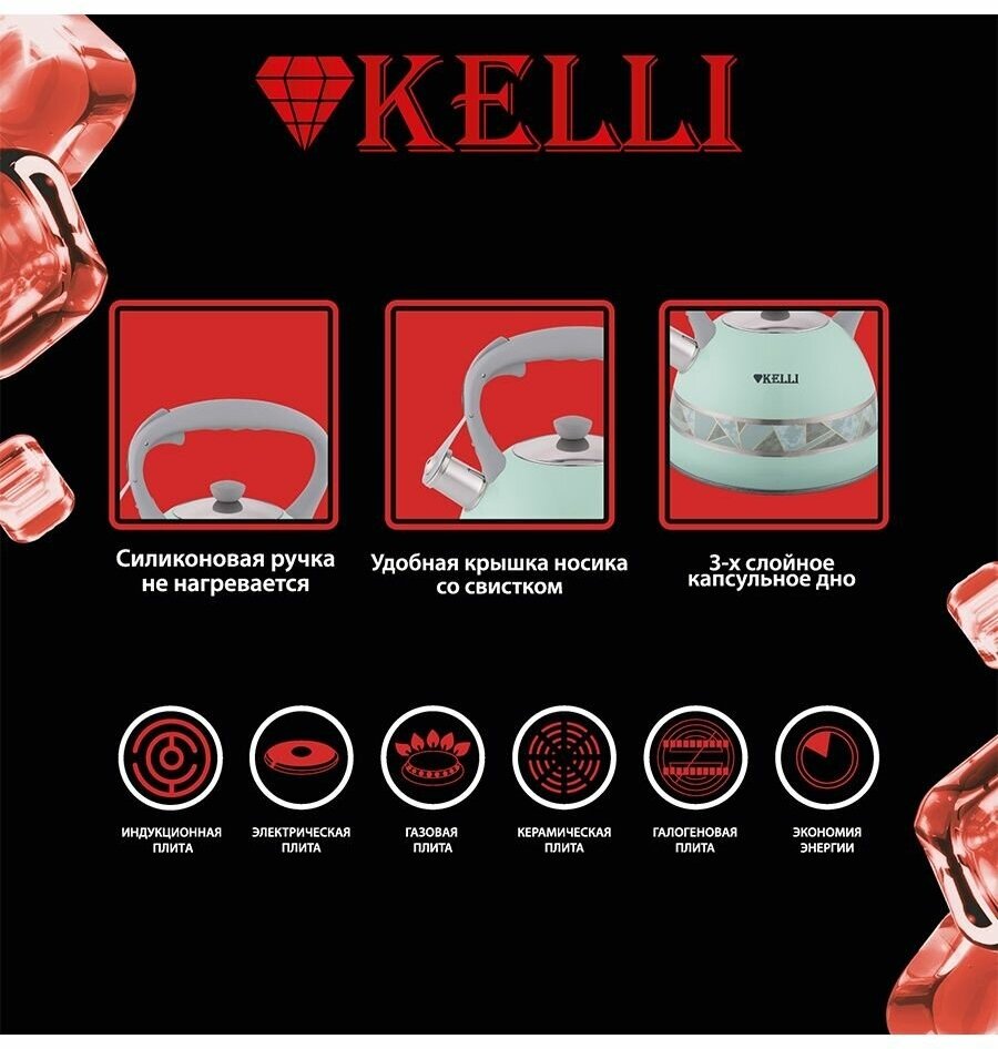 | Комплектация | Чайник Kelli подойдет для использования на конфорках газовых, керамических и электрических моделей кухонных плит, поэтому Вы можете не беспокоиться о сохранности дорогой бытовой техники. Корпус рассматриваемой модели изготовлен из износостойкой нержавеющая стальавеющей стали, придающей ей презентабельный внешний вид |